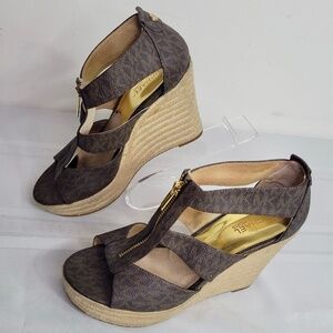 Signature Logo Michael Kors Leather Brown Damita Wedge Sandals Women Sz 7.5 US
