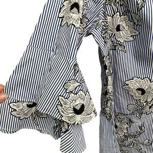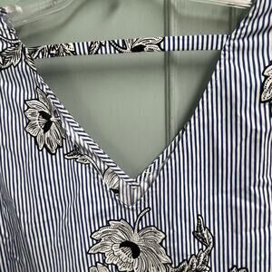 New with tags navy and white striped dress with black and white floral design, size Medium from Signature Studio, have v-neckline in the front and back