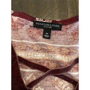 Signature Studio Burgundy Floral Velvet Trim 3/4 Sleeve Stretch Knit Boho Peasant Top Size 2X. Good preowned condition. No stains or holes. Please see photos for details and measurements. Thanks for looking.