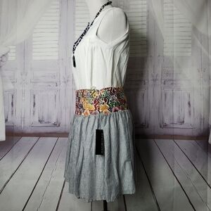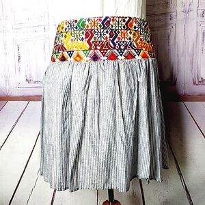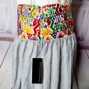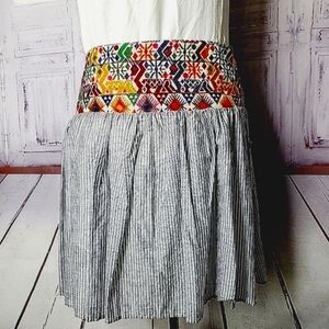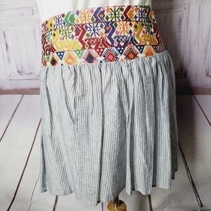 Vibrant multicolor waistband. Striped gray skirt. Perfect for casual outings.