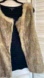 Women’s simplistic and dressy faux fur vest with brown and light tan fur and black knit back panel. Easy open front with scoop corner neckline and slightly oversized fit. No stretch front, slightly stretchy back.