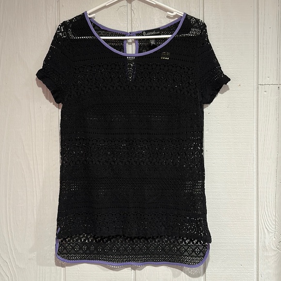 Cute black top with light purple trim. The back is longer than the would be a good swimsuit cover. Says XL but fits more like a large.