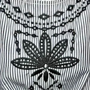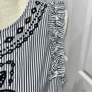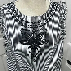 Description: such a cute, embroidered, sleeveless blouse with ruffles at the shoulder, ties at waist for a flattering,slimming look. Fabric print is black and white striped. Keyhole button on back. Very cute!