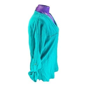 Signature Studio teal gauzy zip neckline roll sleeve summer top M