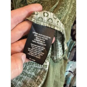 A stylish Signature Studios Green Blouse in Plus Size 1X featuring a burnout graphic design, criss-cross back detail, and flared sleeves. Made of a comfortable blend of spandex and rayon, this tunic-style blouse has a relaxed fit for a flattering look. The brand is Signature Studio, and the accents include applique details.