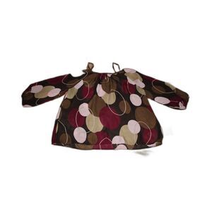 Color: Abstract oval print in brown, burgundy, beige, and white