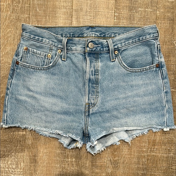 These Signature by Levi Strauss blue jean shorts offer a stylish distressed look with a raw, frayed hem. The light blue denim features natural fading, giving them a vintage appeal perfect for casual outings.