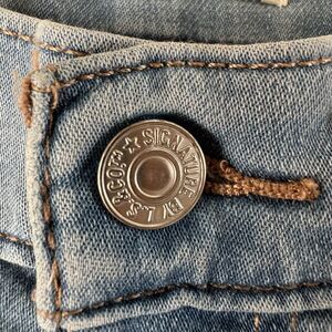 Get ready to ride the range in style with these Signature by Levi's Men's Slim Blue Jeans. Made with a blend of polyester, cotton, and elastane denim fabric that is both durable and machine washable, these jeans feature a solid pattern and a 5-pocket design with a zip and button closure. The low-rise fit and slimming feature will give you a confident and stylish look, while the 28-inch inseam and waist size make them perfect for men of all shapes and sizes.