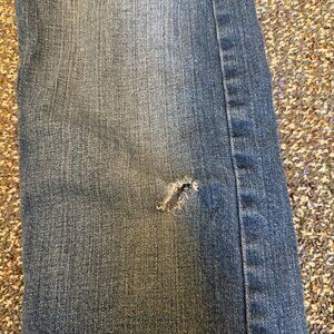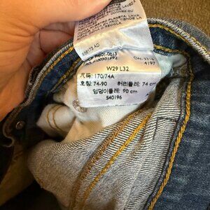 Signature Levi’s straight leg jeans in a classic medium wash with light fading and worn-in texture. One small hole on front of left leg (see photos), otherwise in good pre-owned condition. Tagged men’s size W29 L32.