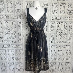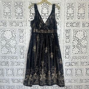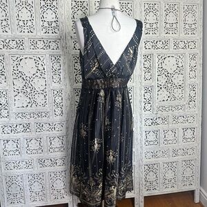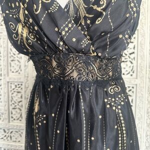 Signature by Robbie Bee Black & Gold Satin Babydoll Faux Wrap V Neck Dress Sz Medium