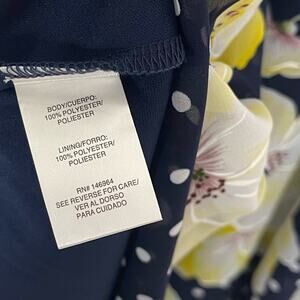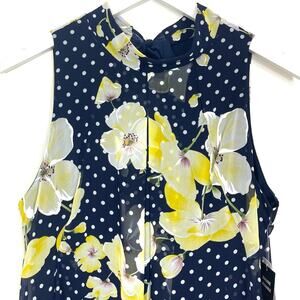 Swingy, chiffon dress with mock neck and contrast tie at back neckline. Sleeveless. Navy blue polka dot and floral print.