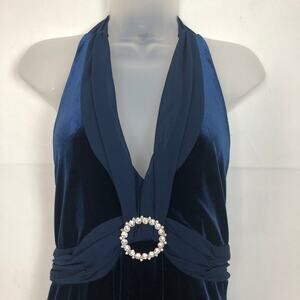 Signature by Robbie Bee velour halter blue dress. Embellished front. V-neck. Hidden zipper in back. Lined bust area. Chiffon collar. Gently used. No visible flaws.