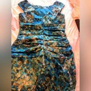 Elegant teal midi dress with black floral pattern. Off-shoulder design. Perfect for special occasions.