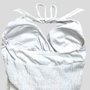 White tie halter neck asymmetrical hem cotton gauzy dress with stretchy rushed bodice with iridescent sequins and built in bra cups. Dress has zipper down the side. Woman’s size 10