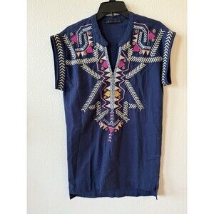 Embrace your bohemian spirit with the Signature8 Womens Blue Embroidered Mini Dress, a charming addition to your wardrobe that's perfect for various occasions. The dress features a vibrant blue hue with a patchwork pattern, creating a unique and eye-catching design. The lightweight blend of cotton and linen ensures comfort and breathability, ideal for the warmer seasons of fall, spring, and summer. Crafted with a flattering V-neck and sleeveless style, this mini dress is a versatile piece for casual outings, cocktail parties, or while traveling. The embroidered accents add a touch of elegance and character to the dress, while the size small fits true to regular sizing. Easy to care for with a simple hand wash, this dress is a effortless staple for any fashion-forward woman.