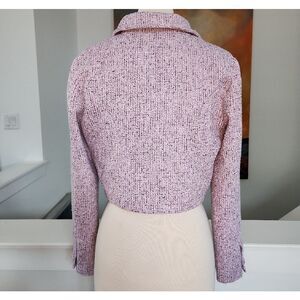 Chic tweed blazer with ponk and black tone. Features a structured collar and front buttons. Perfect for elegant occasions.