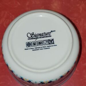 This is a stylish Signature Housewares storage bowl with lid. Great for storing leftovers and then popping in microwave to reheat. It holds about 20 oz. No chips or cracks. Lid shows some wear from usage.