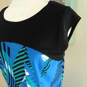 Twelve vertical panels create the shape of this dress. Black on top. Cool colors in a bold graphic design. Soft floaty skirt. Size L measures 40 at chest, 36 at waist, 48 at hips, 39 long from shoulder to hem. This is so flattering, and will move beautifully when you walk.