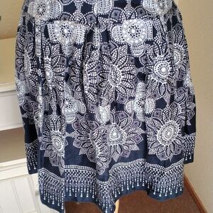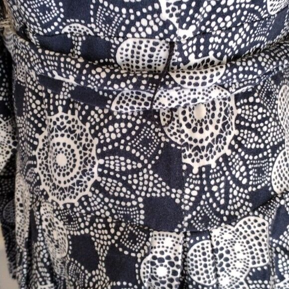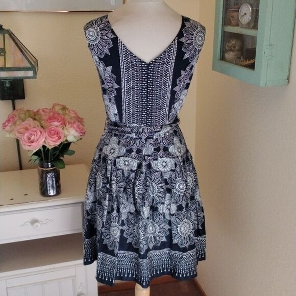 This border print fabric has been used to define the details of this dress. Fitted bodice. Top lined, back zip. Waist seam. Panel around hips with gathers below. Tie belt. Size 6 measures 37 at chest, 30 at waist, 34 at hips, 38 long from shoulder to hem. Perfect for warm weather at work or play.
