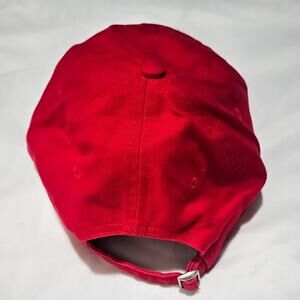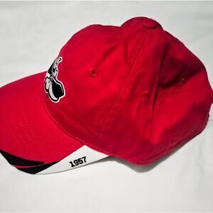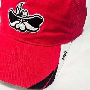 Add a pop of color to your wardrobe with this striking red baseball cap. Crafted for comfort and style, this hat features a unique black and white embroidered Rebels mascot on the front. Brim has a swoop of black and white and 1957 embroidered on the side. The adjustable metal buckle means it's a perfect fit for almost anyone. The holographic official Collegiate Licensed Product label on underside of brim indicates this hat is new. Its classic design makes it suitable for a variety of occasions, from outdoor activities to casual outings.