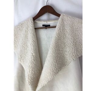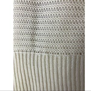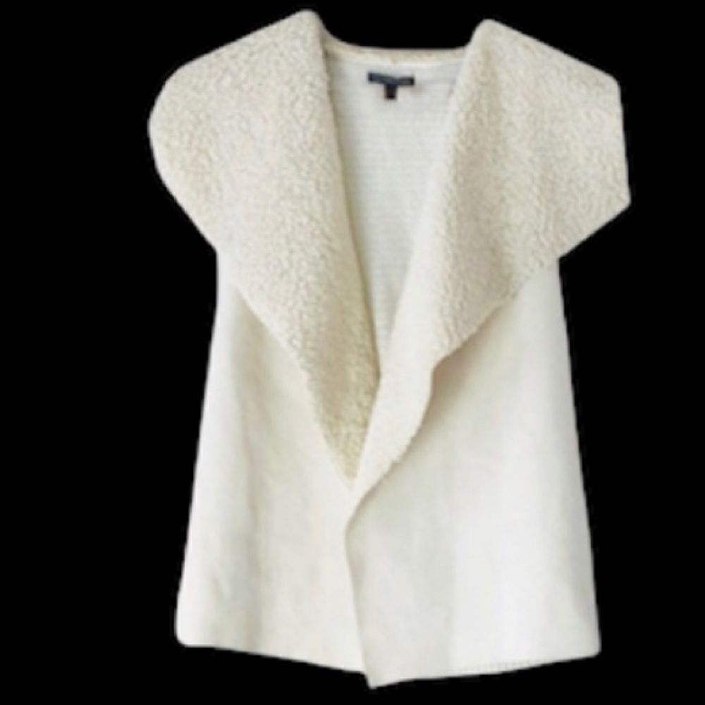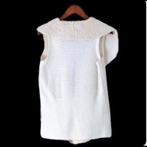 This vest is a size small is sleeveless is open front is white is knitted back is 38% acrylic 62% polyester and machine washable bin 5