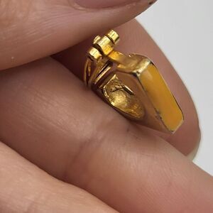Signed 1960 Pat Pending Goldtone Clip On Yellow Enamel Earrings Square 0.5in Materials: gold metal alloy Length: 0.5in Clasp: clip on Signed? 1960 C Pat Pending Excellent vintage condition