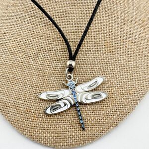Beautifully signed A. Everson Dragonfly Canada pendant showcasing a Northwest Coast Indigenous-inspired design. The piece features a silver tone metal dragonfly accented with blue and white enamel detailing and hangs from an adjustable black cord. This pendant embodies the dragonflys symbolic meaning of transformation, adaptability, and lightcentral themes in Indigenous Pacific Northwest art. Made in Canada, late 1990s to early 2000s, this collectible piece blends cultural symbolism with contemporary artisan craftsmanship. Style it over a cream sweater, linen blouse, or flowy boho dress for an earthy yet elegant statement. Perfect for travel, festivals, or everyday wear with meaningful flair. dragonfly pendant, enamel necklace, A Everson jewelry, Indigenous art, Canada jewelry, Pacific Northwest design, adjustable cord necklace, silver enamel pendant, transformation symbol, artisan jewelry, 1990s vintage necklace