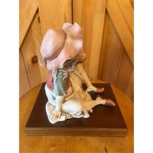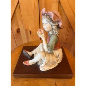 Signed A.G. Armani/Capodimonte Green Eyed Girl Eating Apple Porcelain Sculpture has discolored on hat/chips see pictures missing a felt pad from bottom 7” h 6x5