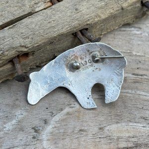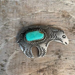 Signed AJC Native American Navajo Sterling Silver Turquoise Bear Pin