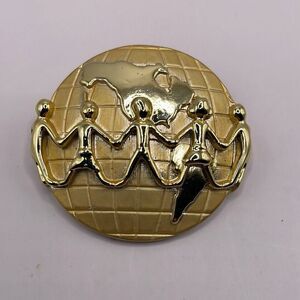 Signed AJC Globe Children Holding Hands Lapel Pin Brooch Goldtone