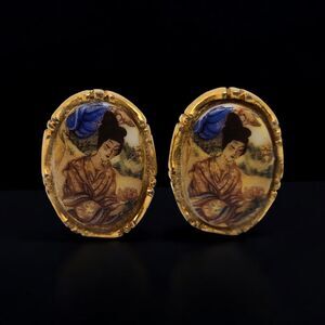 Zoom in for details. Appearance may vary with lights, background, or screen. You will receive the exact earrings shown. Presents with typical vintage wear. Metal and cameo inlay are intact. Clips are strong/tight. Beautiful Geisha in the Garden - Suitor blue sleeve, hand above her. Very lovely. Ready to wear or gift. Enjoy!