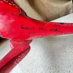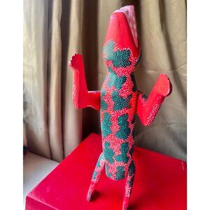 This vibrant handcrafted alebrije lizard by Francisco Sosa Ojeda showcases intricate artistry and craftsmanship. The signed piece reflects traditional Mexican folk art.