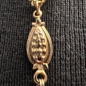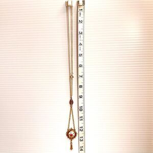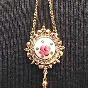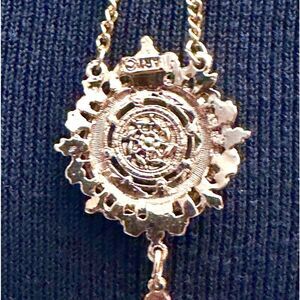 • Style Profile: A beautiful vintage enameled necklace by Arthur Pepper, signed Art Co., in excellent condition. This gold-tone Victorian-style lariat features a round floral enameled focal point, measuring approximately 18 inches with a 3-inch drop chain. Art Co., known for high-end costume jewelry inspired by Edwardian, Egyptian, Renaissance, and Victorian eras, opened in 1940 and peaked in the 1960s. A stunning and collectible piece!