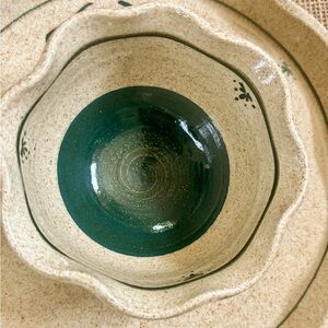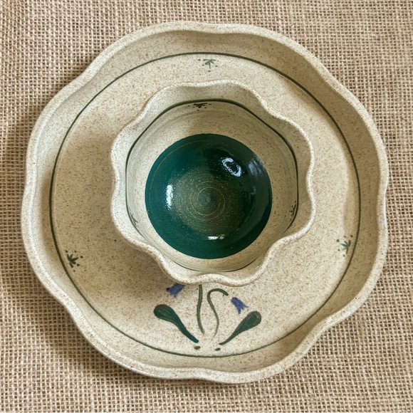 Signed Art Pottery Chip And Dip Dish Bowl Speckled Tan Green Blue Floral Rustic