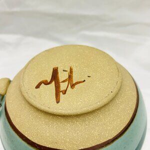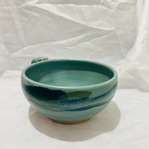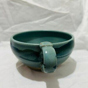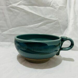 Signed Art Pottery soup mug bowl Teal Blue green glaze Thumb Rest