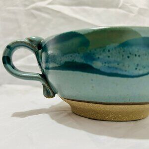 A Hand Made Artisan Pottery Large Soup Mug with Thumb Rest. It is in excellent condition and measures 6" wide (7" with handle) x 3" high.
