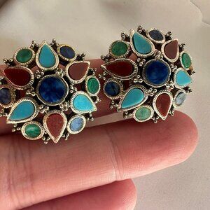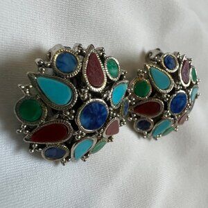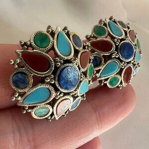 Signed Art Vintage Rainbow Enamel Gold Tone Starburst Estate Clip On Earrings
