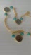 Elegant long necklace with gold chain. Features turquoise beads and silver Italian lira coins. Perfect for adding a pop of color. Measures approximately 17.5” long when clasped and lying flat.