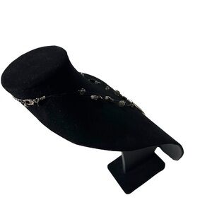 The necklace measures 17-22 inches in length and is signed by Chico's for authenticity. The lobster clasp closure ensures a secure fit, while the mixed media design of metal, leather, and glass creates a unique statement piece. Perfect for anyone who loves trendy, fashionable jewelry that is both beautiful and versatile.