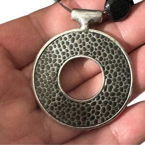 Add a touch of bohemian flair to your wardrobe with this stunning necklace from Chico's. The 3-strand necklace features a round, pot metal pendant with a pebbled / snake skin leather inset. The adjustable multi-strand wire chain is adorned with beautiful black and white art glass beads and sterling silver beads. The adjustable wire chain is perfect for any occasion, from everyday wear to special events.