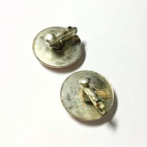These vintage jewelry earrings measure about 1" across. Cheery bright red plastic disks are set into a goldtone frame. The earrings have screwdown clips, which are signed Coro. There is a little discoloration to the plating on the front and back.