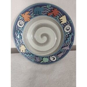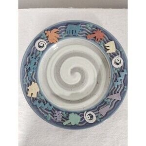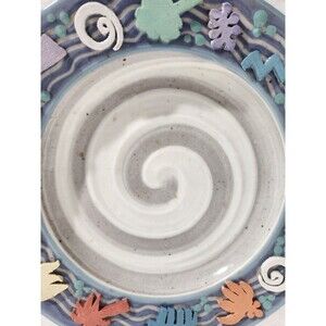 The plate has a glossy and textured matte finish, with an incised backstamp. It is handmade and produced using art pottery techniques. The plate is perfect for decorative use or as a functional piece for serving food. Care instructions are included, and the plate should be hand washed only. This plate is a perfect addition to any collection of decorative cookware, dinnerware, and serveware.