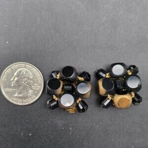 These vintage Eugene clip on earrings feature 1" D clusters of black square beads with brushed gold tone sides.
