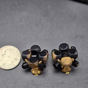 Signed Eugene Black Beaded Cluster Clip On Earrings Brushed Gold Tone Vintage