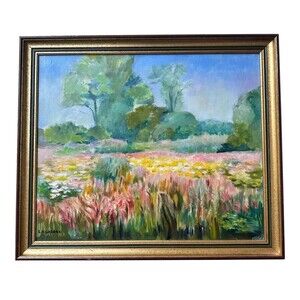 Brought directly from the Loire Valley, France, this signed oil on canvas captures the serene beauty of a sunlit wildflower meadow in full bloom. Layers of soft greens, vibrant yellows, and rosy pinks create a luminous scene, with tall trees swaying under a gentle blue sky. The artist’s impressionistic brushwork and masterful color blending evoke the peaceful charm of the French countryside.