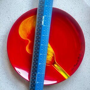 A vibrant decorative plate with a striking red and yellow calla lily design by Givenchy. Suitable for display or functional use.