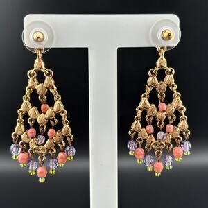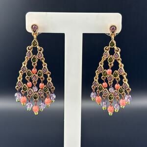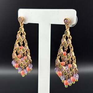 Signed Graziano Gold Tone Pastel Rhinestone Chandelier Pierced Earrings 2.25"