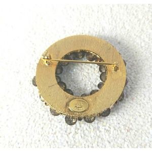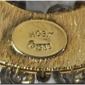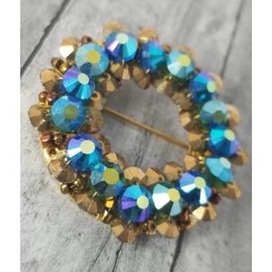 This beautiful vintage Hobe brooch is decorated with wired, sequin-style faceted cut gold-colored and aurora borealis crystal beads and small gold-colored seed beads. Has a textured gold-tone back.