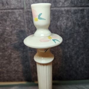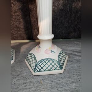 These beautiful ceramic candlesticks are a perfect addition to any home decor. The pink and green floral design with lattice edges adds a touch of elegance to any room. Measuring at 12 inches tall, they are the perfect size for a standard sized candle.