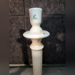 These beautiful ceramic candlesticks are a perfect addition to any home decor. The pink and green floral design with lattice edges adds a touch of elegance to any room. Measuring at 12 inches tall, they are the perfect size for a standard sized candle.